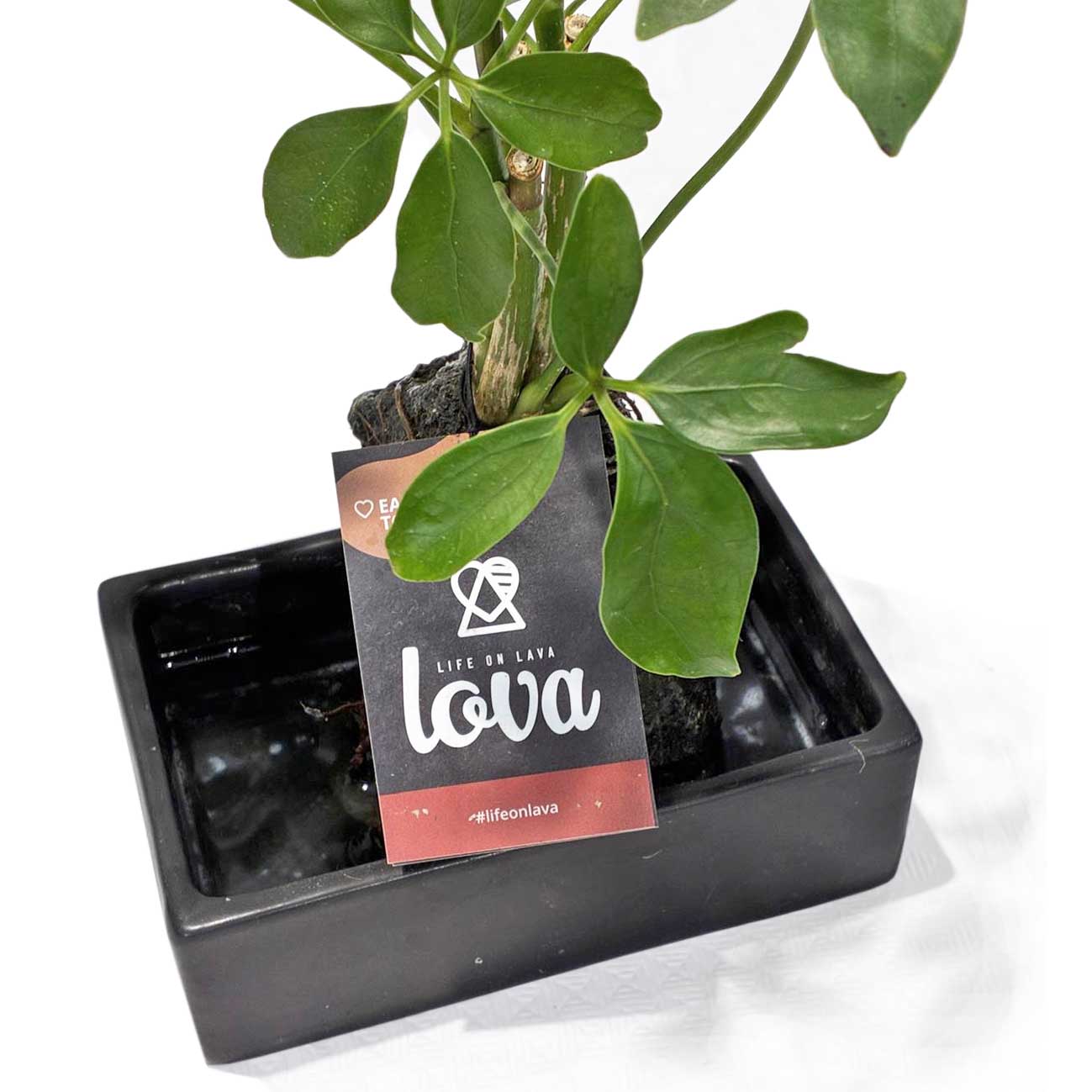 Nuestra composición LOVA se trata de una planta, en este caso la Schefflera enraizada sobre una piedra de lava volcánica. Prácticamente sin mantenimiento, solo revisa que haya agua en el recipiente y esté en un sitio iluminado y a disfrutar ver crecer a tu LOVA.