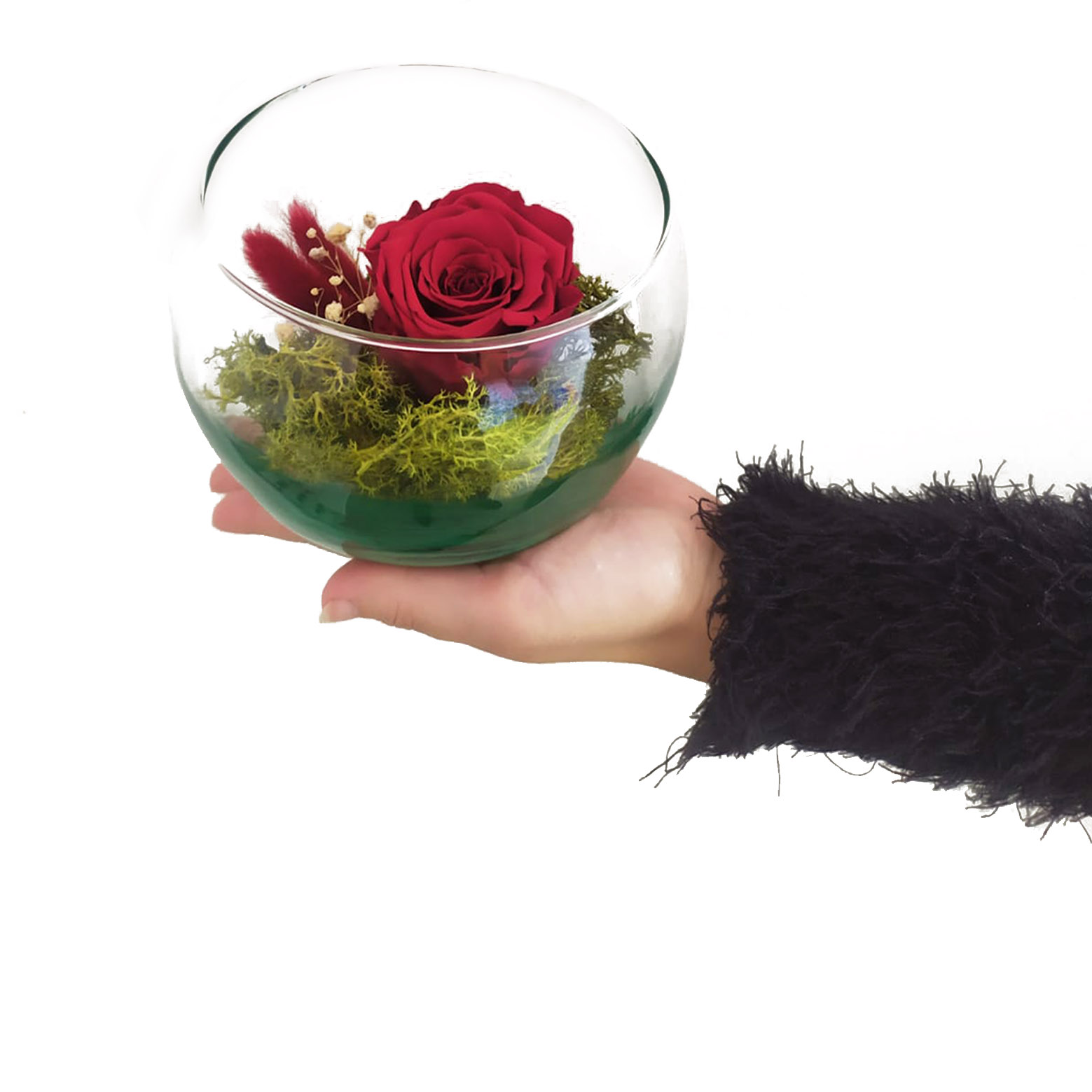 La rosa eterna Medialuna es el máximo símbolo de amor y sofisticación. Una gran rosa central con una composición delicada de flores preservadas y musgo preservado
